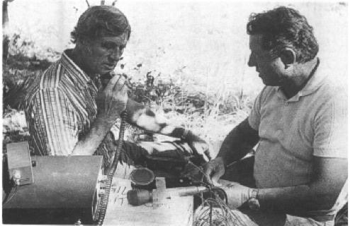 Ken Fry MHR, left, speaking to Fretilin in East Timor with radio operator, Brian Manning, right.